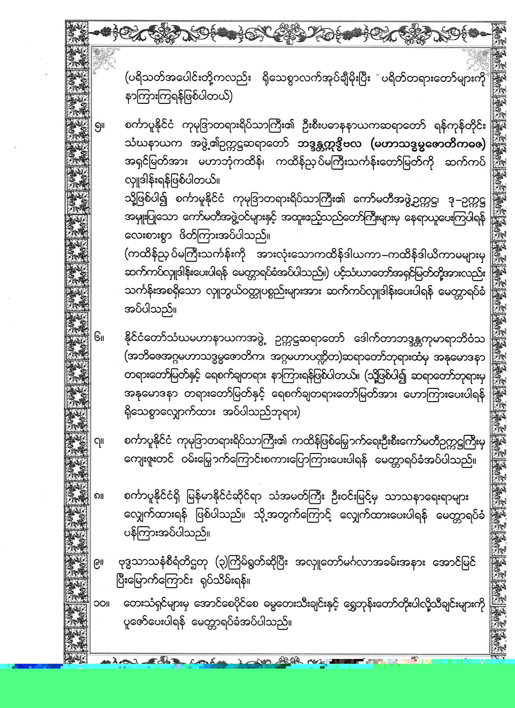 The above mentioned honorable, highly estimable Sayadaws will deliver Buddha's preaching on wining to reach Nirvana, the endless bliss Dhamma to donors and all lay persons, and therefore we holders of this Noble Ceremony with full regards and affection invite you to surrender you donation together with us and participate in making libation on our good deeds and say Sadu (in praise of our noble achievement).